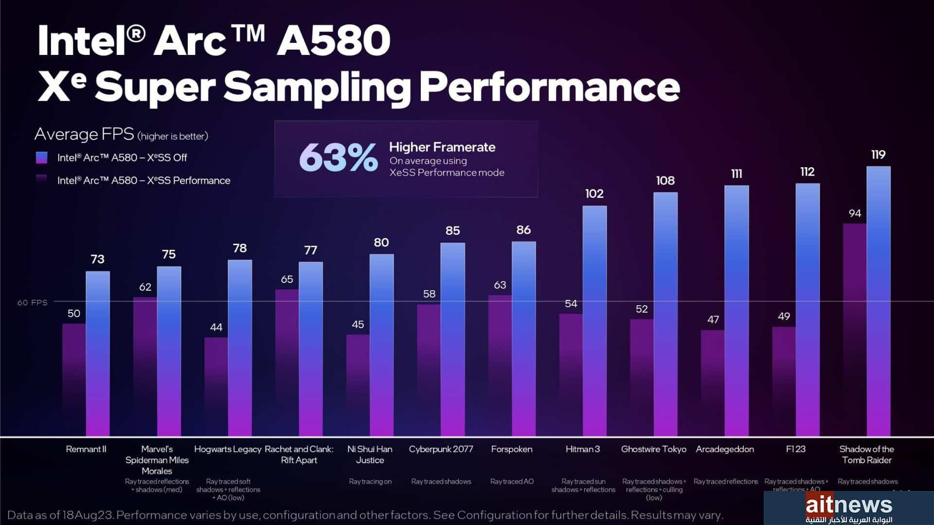 يُعد مستوى الأداء وفقًا للرسم البياني القادم من إنتل جيدًا خاصةً بعد تفعيل خاصية Xe Super Sampling التي تسمح بزيادة معدل الإطارات بشكلٍ واضح؛ وهي تقنيةٌ تعتمد على خوارزميةٍ قائمةٍ على الذكاء الاصطناعي لتُحسن من جودة المشاهد الرسومية وفي الوقت نفسه تزيد من معدل الإطارات مما يجعلها منافسةً لتقنية إنفيديا DLSS.