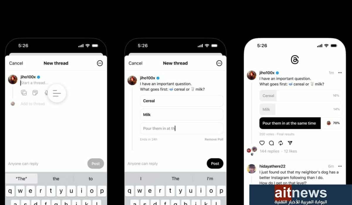 يستنسخ تطبيق ميتا المنافس لمنصة إكس، ثردز، بعض المزايا الإضافية مع إطلاق الدعم لاستطلاعات الرأي والصور المتحركة.