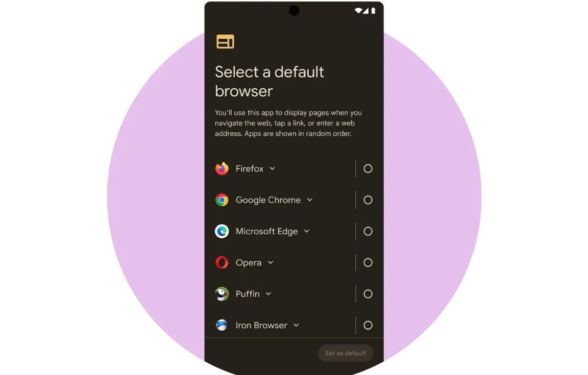 وتقدم جوجل ضمن أندرويد شاشة جديدة لاختيار المتصفح أثناء الإعداد الأولي للجهاز، على غرار ما تقدمه للسماح للمستخدمين بالاختيار بين محركات البحث المختلفة.