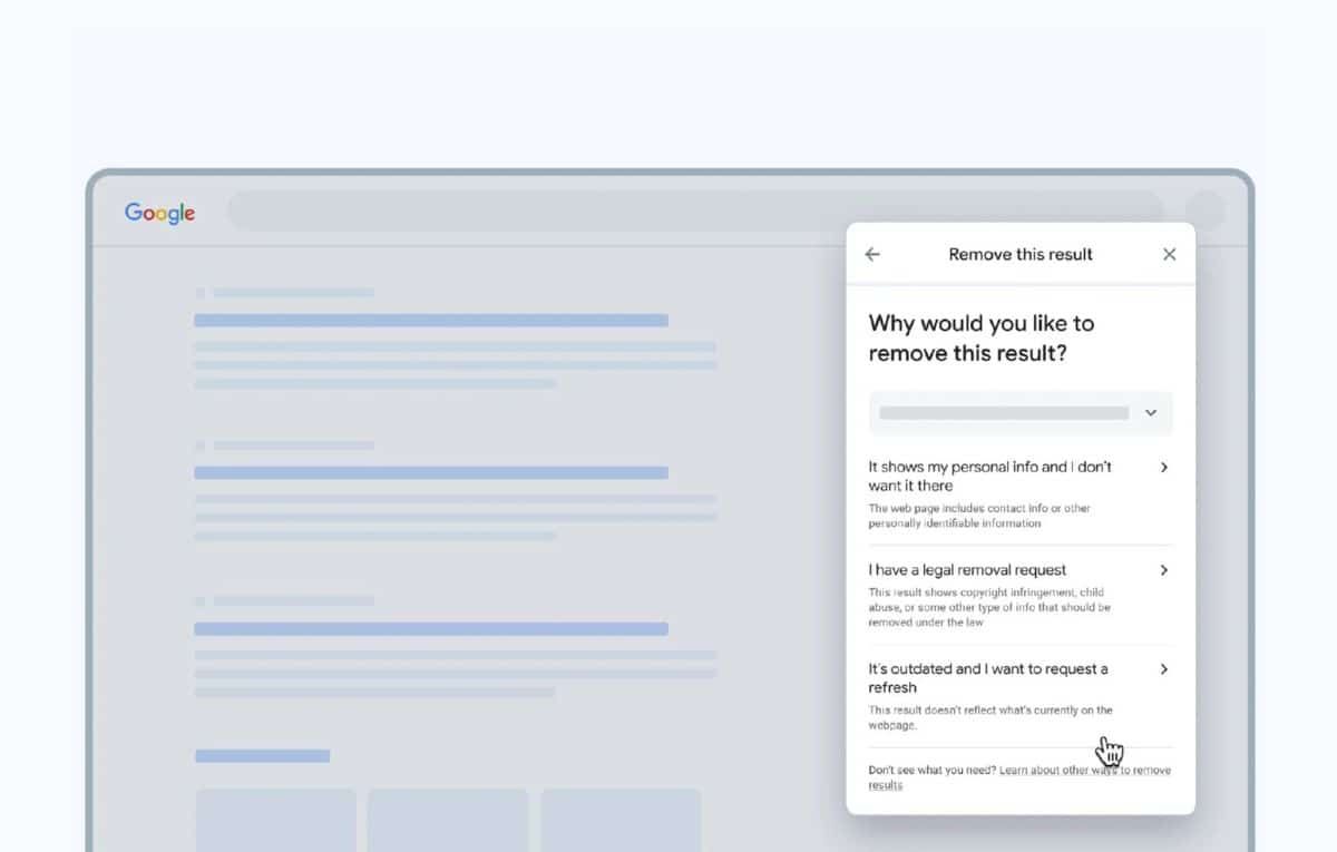 وعند طلب الإزالة، تظهر للمستخدم ثلاثة خيارات رئيسية، وهي “إزالة المعلومات الشخصية”، مثل المحتوى الذي يُستخدم في التشهير أو الكشف غير المصرح به عن البيانات، أو “طلبات الحذف القانونية”، التي تشمل انتهاك حقوق النشر أو المحتوى غير القانوني، أو “تحديث نتائج البحث القديمة”، وهي ميزة جديدة تتيح للمستخدمين إبلاغ الشركة بإعادة فحص المواقع إذا حُدّثت بياناتهم أو حُذفت من المصدر دون أن ينعكس ذلك في نتائج البحث.
