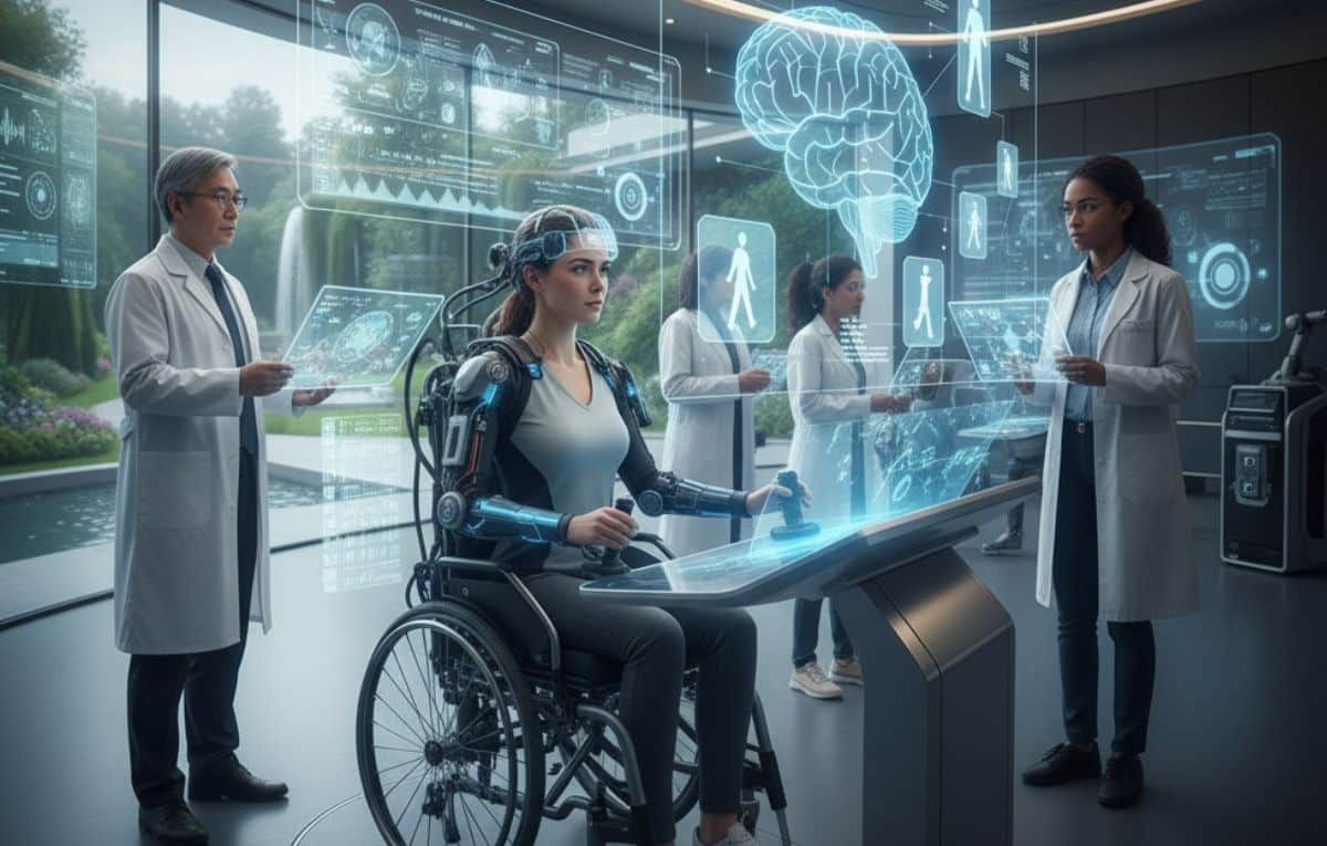 طوّر باحثون نظام واجهة الدماغ والحاسوب (Brain–Computer Interface System) غير جراحي ومدعوم بالذكاء الاصطناعي، يتيح للمستخدمين التحكم في ذراع روبوتية أو مؤشر شاشة بسرعة ودقة عالية. ويعمل النظام على تحويل إشارات الدماغ المسجلة بتقنية تخطيط النشاط الكهربائي للدماغ (EEG) إلى أوامر حركية، مع وجود كاميرا مدعومة بالذكاء الاصطناعي تفسر نوايا المستخدم لحظيًا.