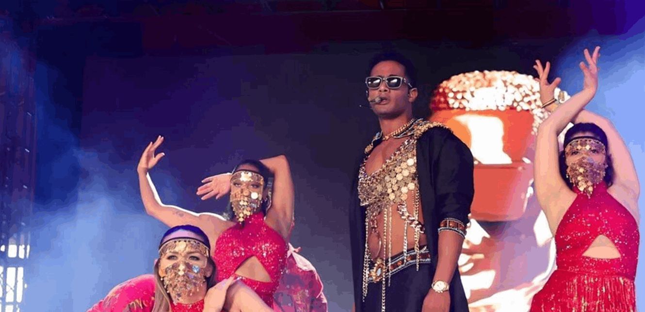 وظهر محمد رمضان بقطعة علوية "توب" مزيّنة بسلاسل معدنية وقطع ذهبية واكسسوارات، بطراز يشبه الأزياء الفرعونية مع لمسة عصرية جريئة، ونسّقها مع عباءة سوداء مفتوحة مطرّزة من الأطراف، وأكمل الإطلالة بإكسسوارات لامعة ونظارة شمسية، مع لوك مسرحي لافت يناسب أجواء المهرجان. (روسيا اليوم)