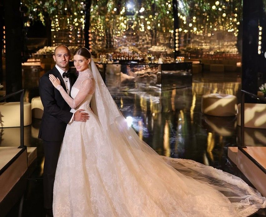وتميز الحفل بفخامته، كما خطفت العروس الأنظار بجمالها، حيث ارتدت فستانا من توقيع المصمم اللبناني العالمي ايلي صعب.