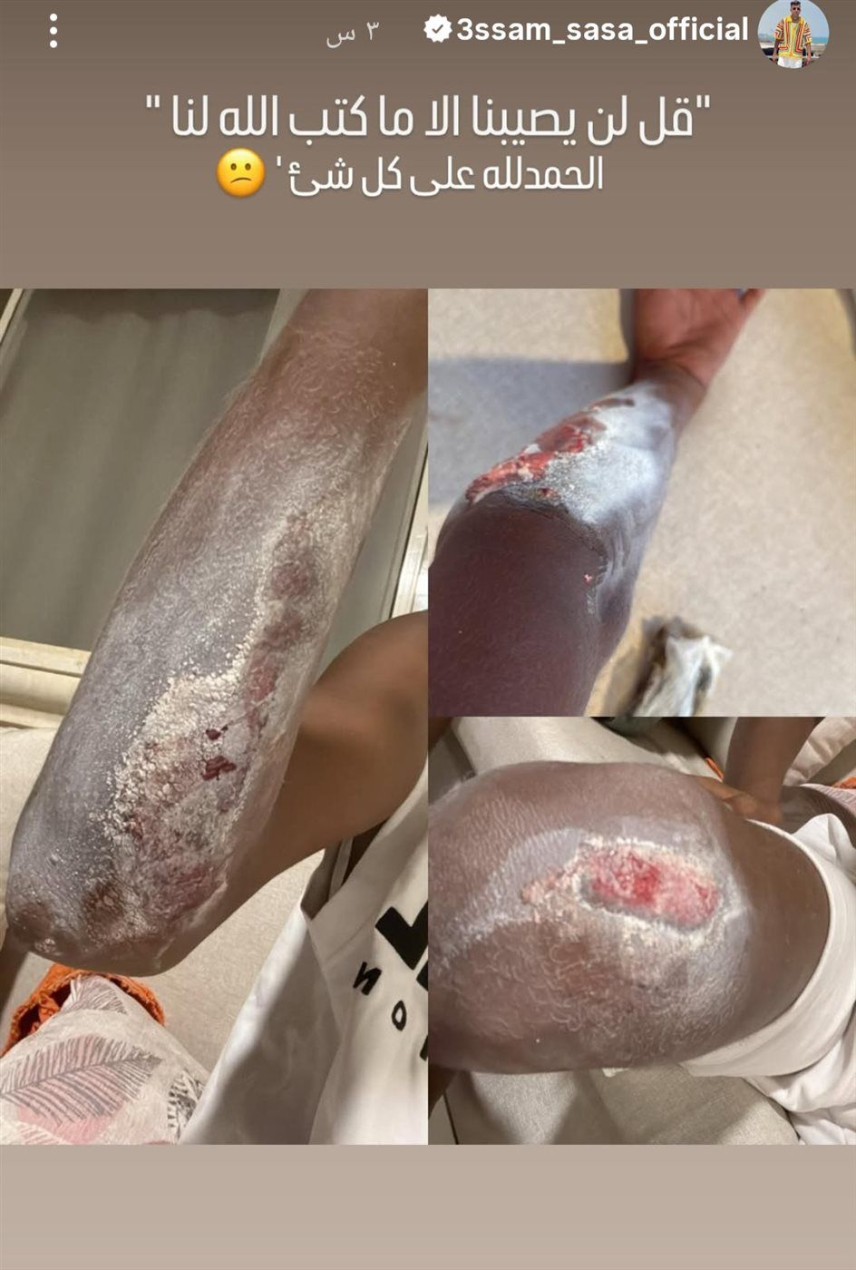 ونشر صاصا صورا عبر حسابه على فيسبوك أظهرت تعرضه لجروح عميقة وكدمات في ذراعه وقدمه، وهو ما أثار قلق متابعيه.