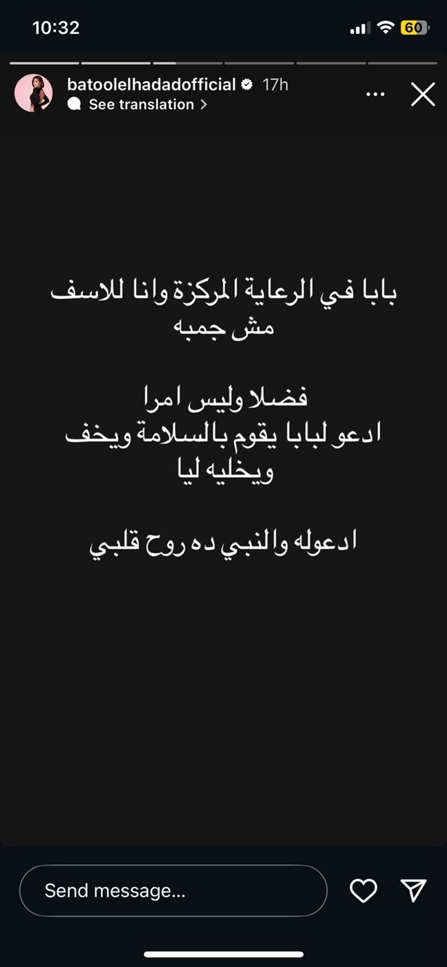 أعلنت الفنانة بتول الحداد عن تعرض والدها لوعكة صحية استدعت إدخاله إلى العناية المركزة، حيث طلبت من جمهورها الدعاء له بالشفاء العاجل، وقالت عبر خاصية "الستوري" على حسابها في إنستغرام: "بابا في الرعاية المركزة.. وأنا للأسف مش جنبه.. فضلًا وليس أمرًا ادعوا لبابا يقوم بالسلامة ويخف.. ده روح قلبي".