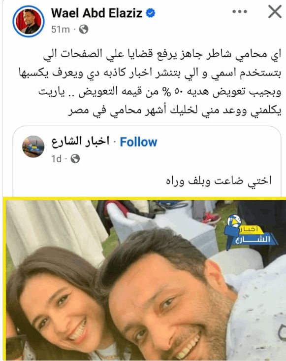 وكتب الفنان وائل عبد العزيز: "أي محامي شاطر جاهز يرفع قضايا علي الصفحات اللي بتستخدم اسمي و اللي بتنشر أخبار كاذبة دي ويعرف يكسبها ويجيب تعويض هدية 50% من قيمة التعويض.. ياريت يكلمني ووعد مني لخليك أشهر محامي في مصر".