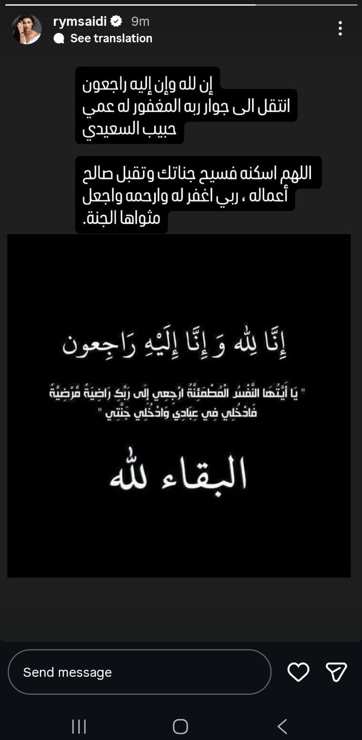 وقالت ريم عبر خاصية "ستوري" عبر حسابها على "انستغرام": "إن لله وإن إليه راجعون، انتقل إلى جوار ربه المغفور له عمي حبيب السعيدي".