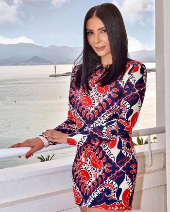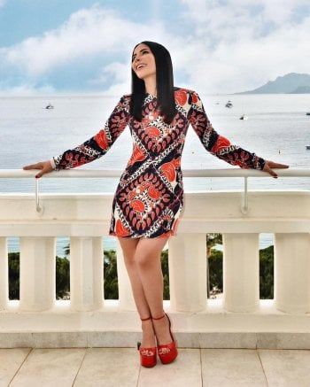 وظهرت منى زكي من على شرفة الفندق الذي تقيم فيه، وهي ترتدي فستاناً قصيراً وضيقاً وأيقاً للغاية، من عدة ألوان ونقشة مميزة، ونسقت مه حذاء صيفي باللون الأحمر.