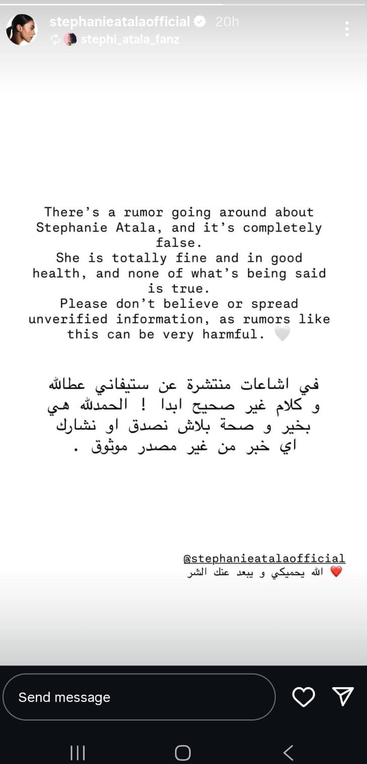 وقال المنشور: "فيه إشاعات منتشرة عن ستيفاني عطالله وكلام غير صحيح أبداً!" وأضاف: "الحمدلله هي بخير وصحة، وبلاش نصدق أو نشارك أيّ خبر من غير مصدر موثوق". Advertisement