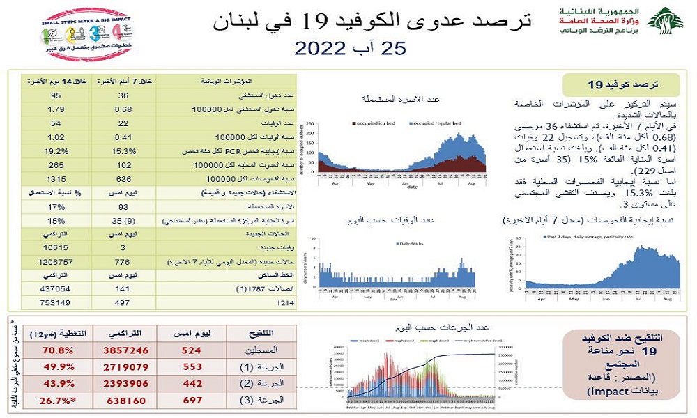 أعلنت وزارة الصحة العامة في تقريرها اليومي تسجيل 776 إصابة جديدة بفيروس كورونا رفعت العدد التراكمي للحالات المثبتة الى 1206757، كما تم تسجيل 3 حالات وفاة.