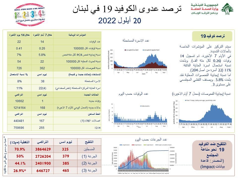أعلنت وزارة الصحة العامة عن تسجيل 168 إصابة جديدة بفيروس كورونا ليرتفع العدد التراكمي للإصابات منذ بدء انتشار الوباء إلى 1214164. كما وسجل لبنان حالة وفاة واحدة ما رفع العدد التراكمي للوفيات إلى 10662.
