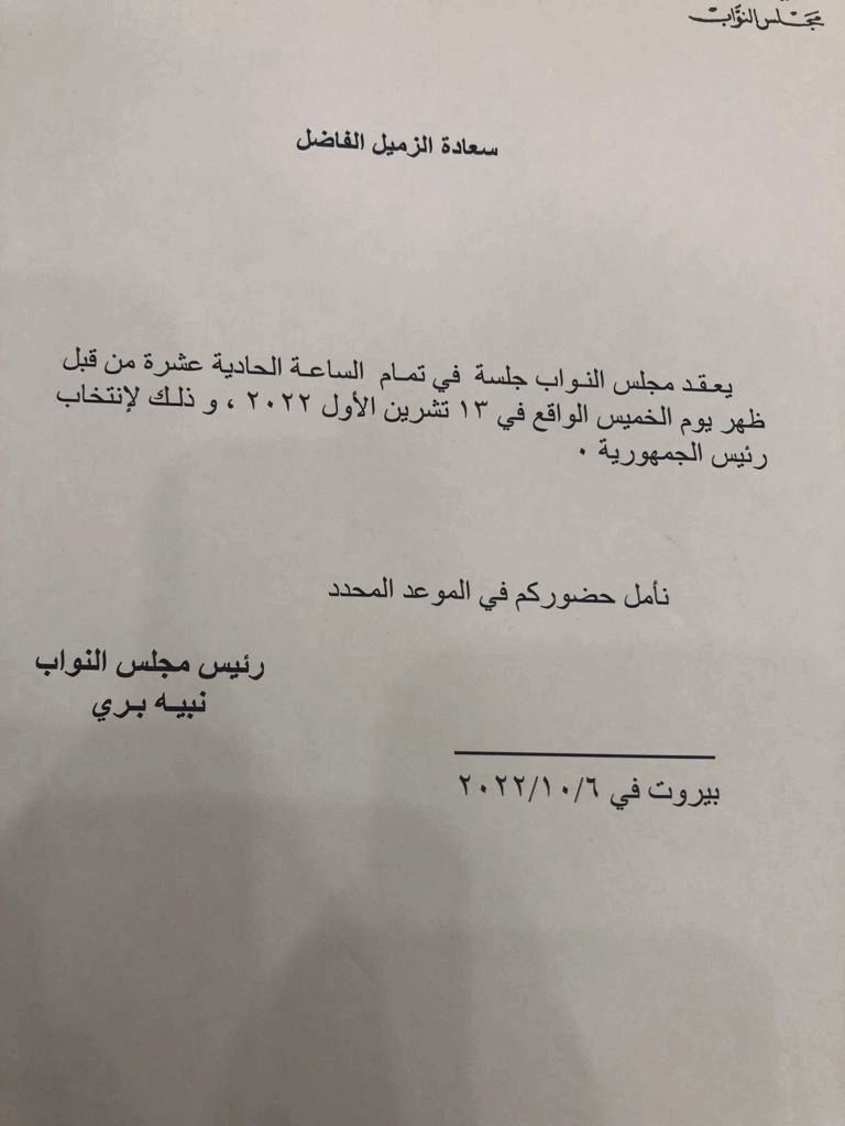 دعا رئيس مجلس النواب نبيه بري الى عقد جلسة في تمام الساعه 11:00 من قبل ظهر يوم الخميس الواقع في 13 تشرين الاول 2022، وذلك لانتخاب رئيس للجمهورية.