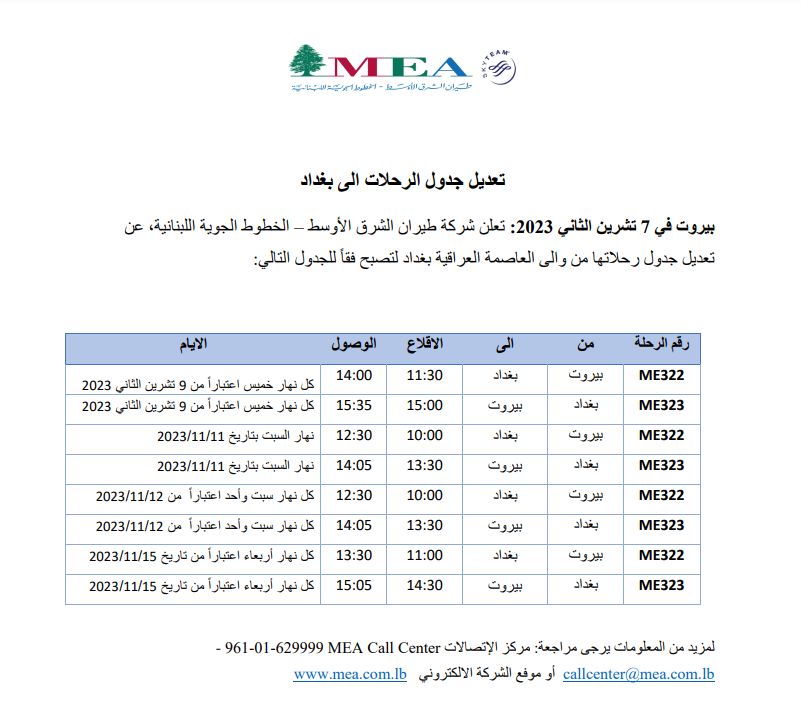 أعلنت شركة طيران الشرق الأوسط - الخطوط الجوية اللبنانية عن تعديل جدول رحلاتها من وإلى العاصمة العراقية بغداد.