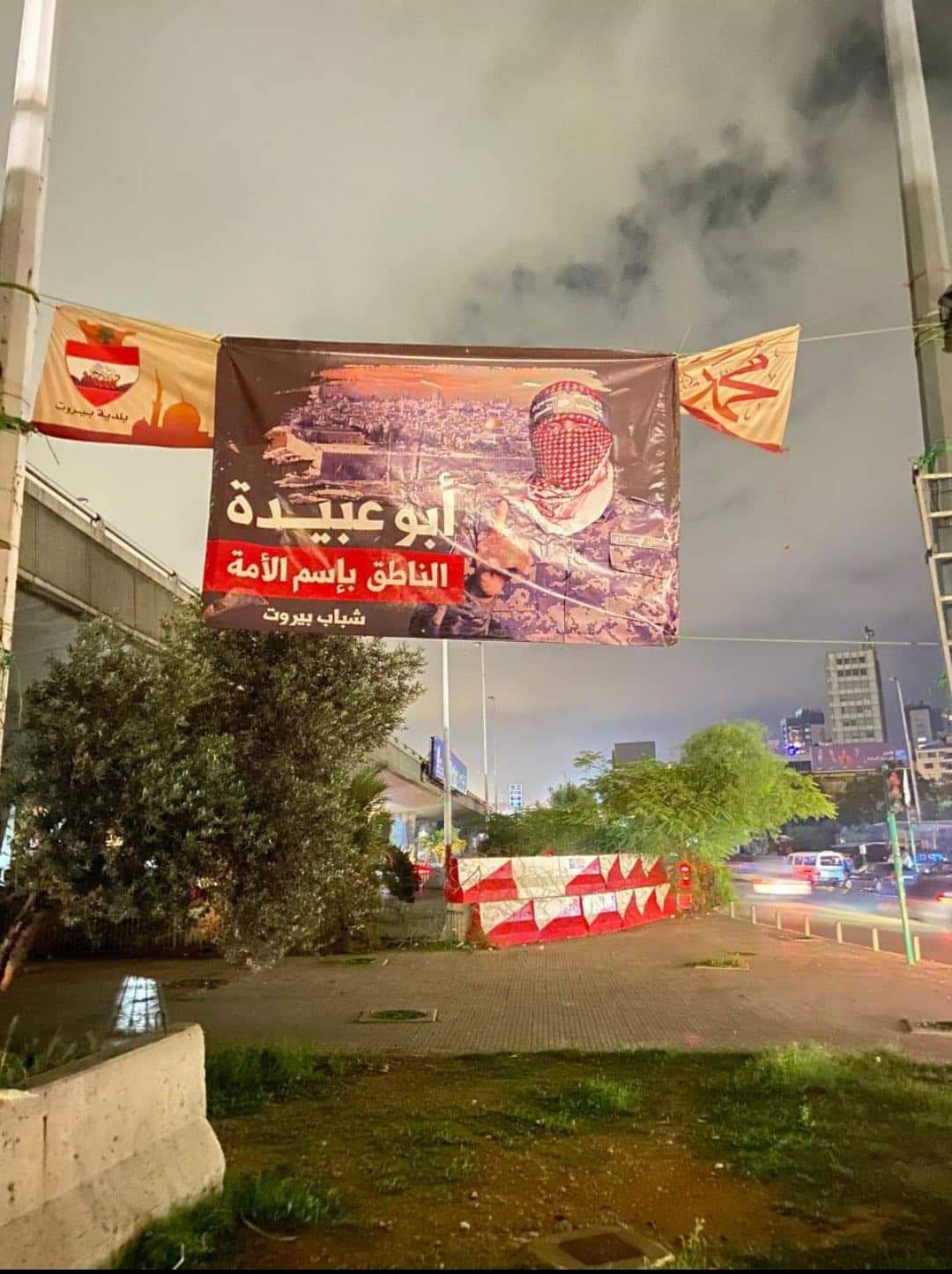 تناقل ناشطون عبر مواقع التواصل الإجتماعي لقطة مُصوّرة للافتة جرى تعليقها في بيروت وتحديداً في محلة الكولا، تضمنت صورة أبو عبيدة، الناطق العسكري بإسم كتائب "عزالدين القسام" (الجناح العسكري لحركة حماس).