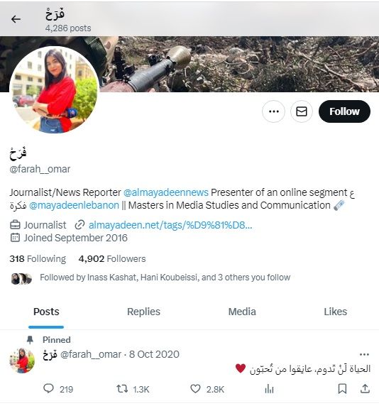 تداول رواد مواقع التواصل الإجتماعيّ، تغريدة قديمة للصحافيّة الشهيدة فرح عمر، قامت بتثبيتها، لتكون التغريدة الأولى على حسابها على منصّة "إكس"، حيث قالت فيها: "الحياة لَنْ تَدوم، عانِقوا من تُحبّون".