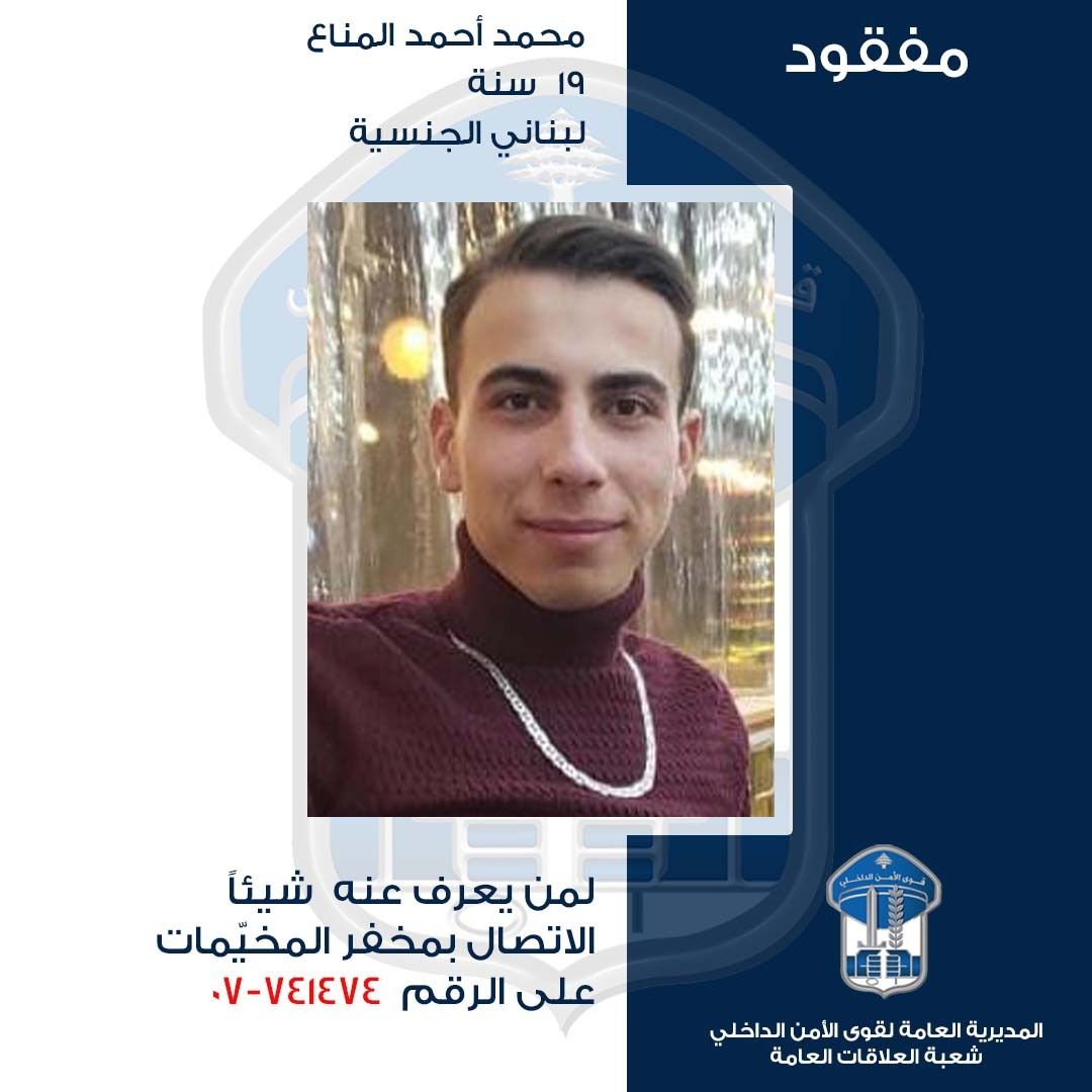 عمّمت المديريّة العامّة لقوى الأمن الداخلي، بناءً على إشارة القضاء المختص، صورة المفقود: محمد احمد مناع (مواليد عام 2004، لبناني)، الذي غادر بتاريخ 12-12-2023 منزله الكائن في بلدة برج الشمالي-صور، ولم يعُد لغاية تاريخه.