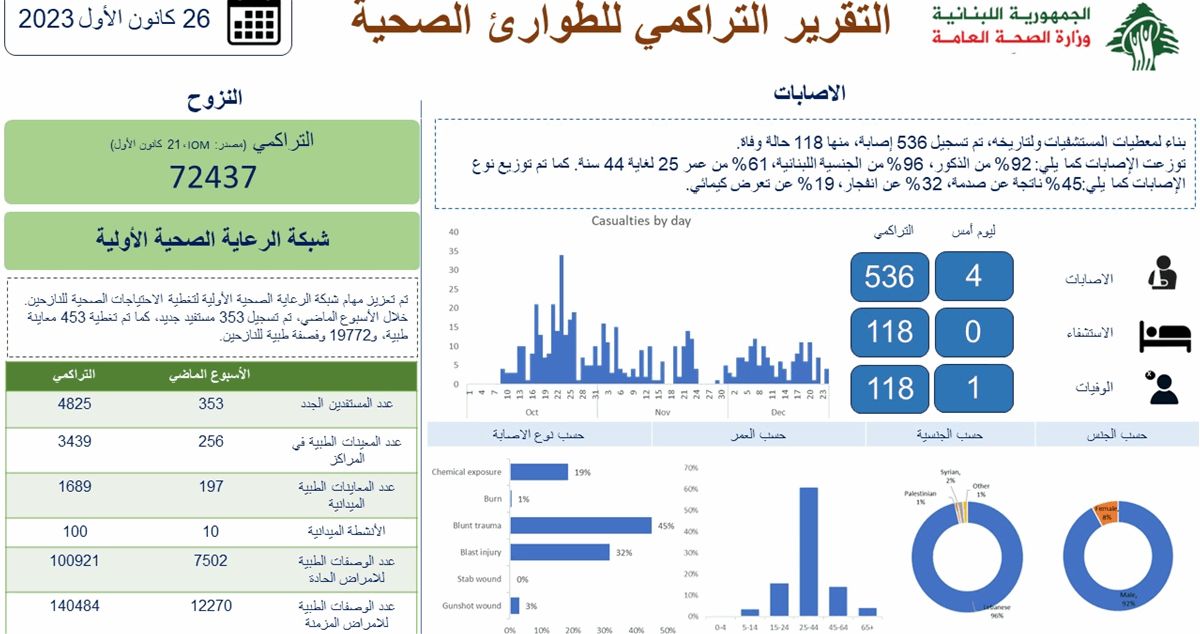 نشرت وزارة الصحة العامة، الثلاثاء، وفي إطار متابعة تداعيات العدوان الاسرائيلي على جنوب لبنان، التقرير التراكمي للطوارئ الصحية حتى يوم 26 كانون الأول 2023. التقرير في الصورة المُرفقة:
