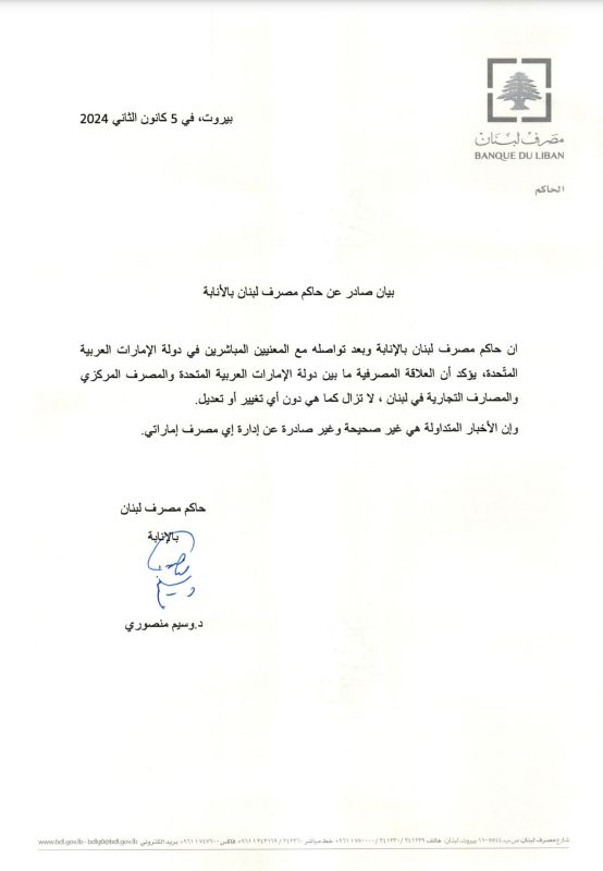 صدر عن حاكم مصرف لبنان بالإنابة وسيم منصوري بيان أكد فيه أن العلاقات المصرفية مع دولة الإمارات العربية المتحدة لا تزال كما هي من دون تغيير أو تعديل.