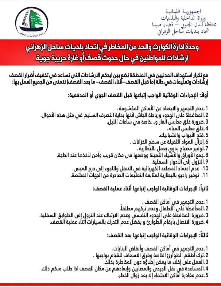 أصدرت وحدة إدارة الكوارث والحدّ من المخاطر في اتحاد بلديات ساحل الزهراني، إرشادات للمواطنين، في حال حدوث قصف أو غارة جويّة، ودعتهم إلى: