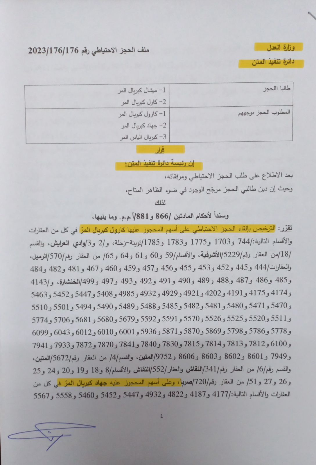 وقضى القرار بالحجز على كامل أملاك وعقارات وشركات وأسهم شركات كبريال وجهاد وكارول المر.