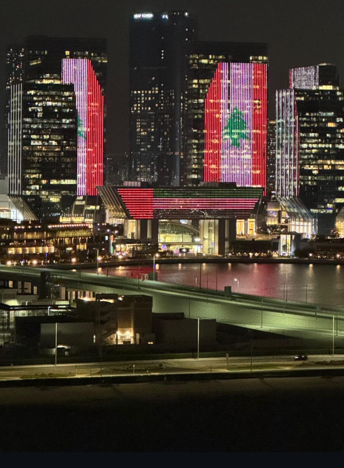 شهدت العاصمة الإماراتية أبو ظبي مساء اليوم الخميس، إضاءة علم لبنان بإجراء "انعكاس ضوئي" على مبنيين كبيرين، وذلك في خطوة تعكس مشهداً تضامنياً جديداً.