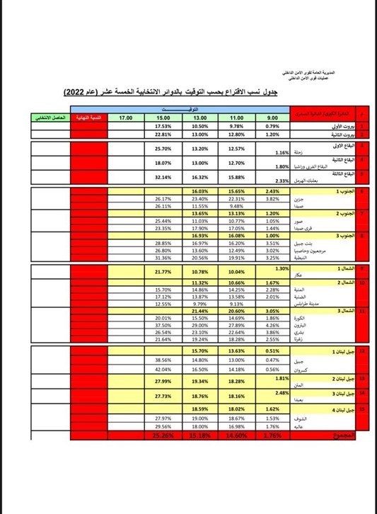 بلغت نسب التصويت في الأقضية بحسب المديرية العامة لقوى الأمن الداخلي حتى الساعة الثالثة: