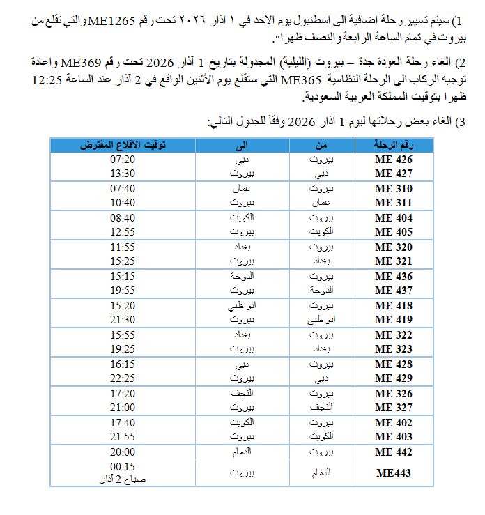 طيران الشرق الأوسط: تعديلات على بعض الرحلات ليوم 1 آذار