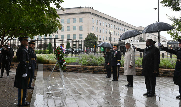 وشكر وزير الدفاع لويد أوستن، في كلمته، عناصر القوات المسلحة على تضحياتهم وخدماتهم، مؤكداً أن الولايات المتحدة “تتذكر اليوم أرواح ضحايا هجمات 11 أيلول الإرهابية”.