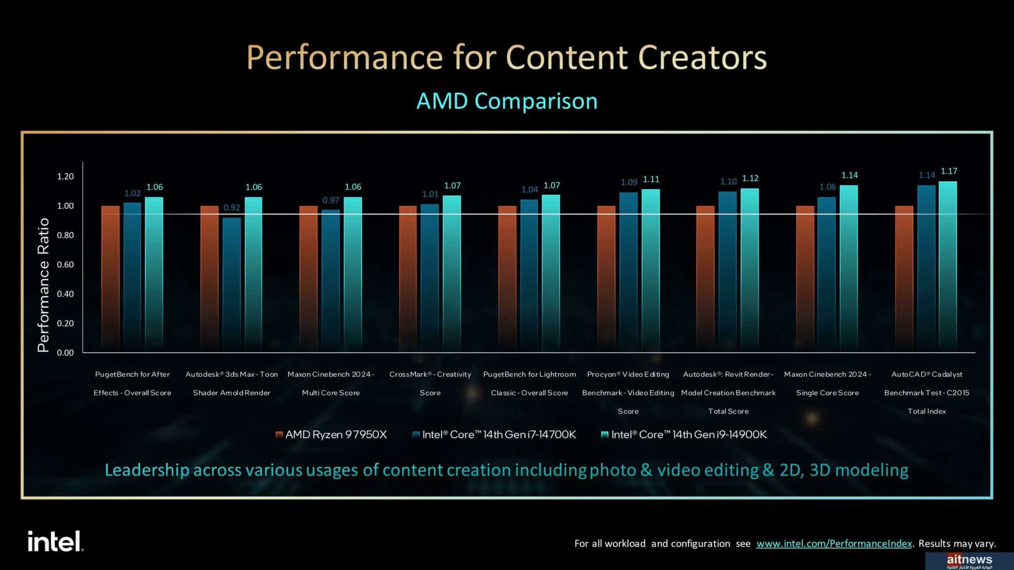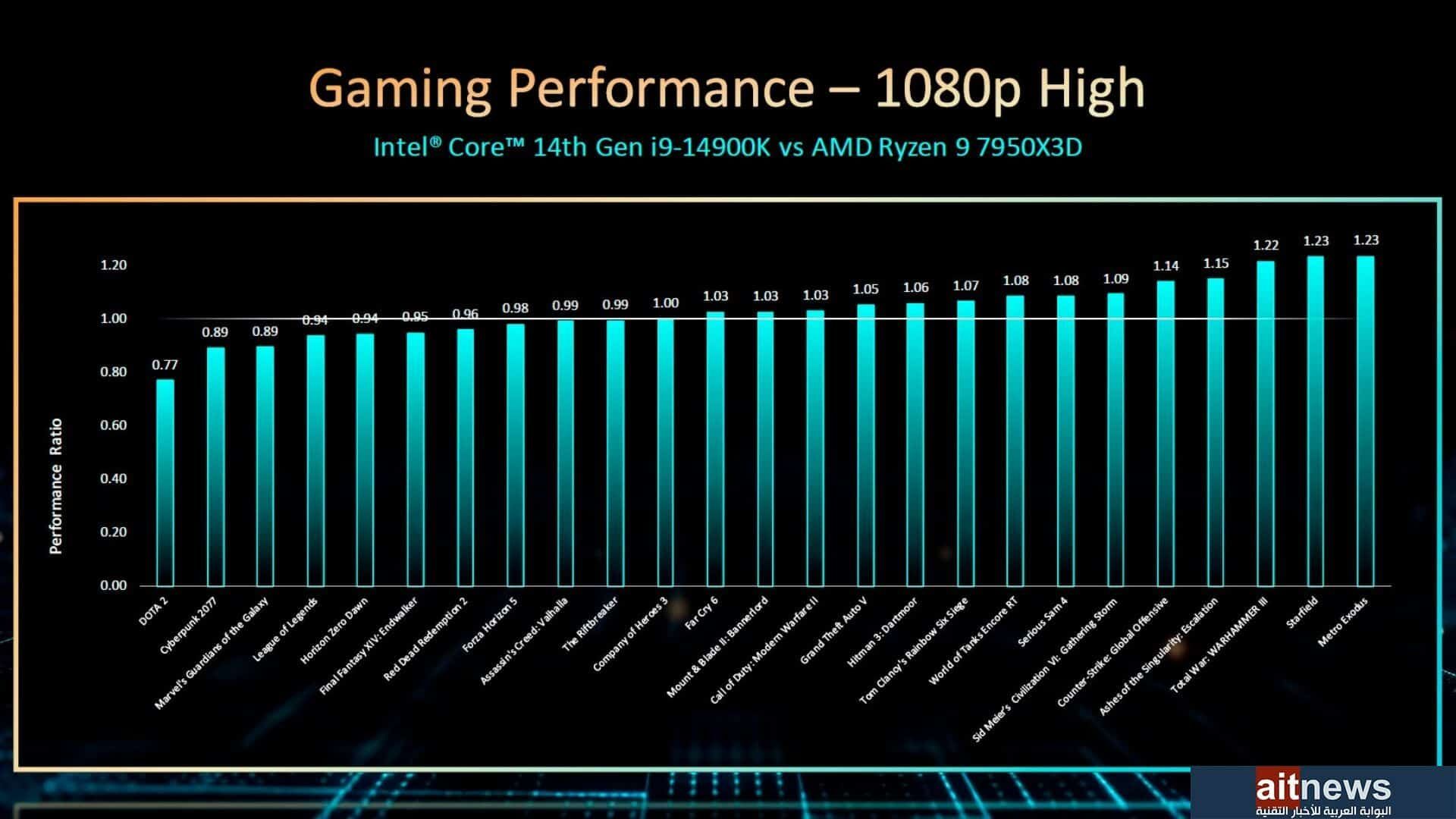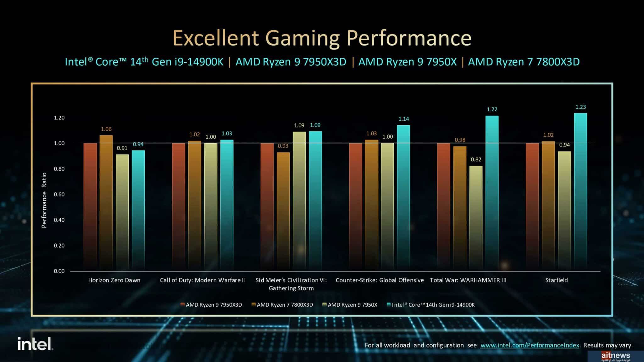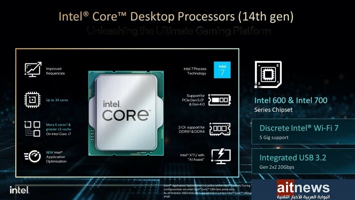 شاركتنا إنتل نتائجها الخاصة من ناحية الأداء لتؤكد أن معالجات Core من الجيل الرابع عشر تحقق زيادة في أداء الألعاب بنسبة تصل إلى 23% مقارنة بالمعالجات المنافسة، مع المزايا الجديدة التي تساعد اللاعبين مثل Application Optimization (APO) و Thread Director.