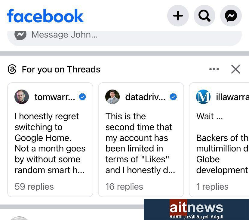ولاحظ https://twitter.com/MattNavarra/status/1714924801783992460?t=MS1UILG0WXci-GLgF-bjaA&s=19 ظهور منشورات ثردز أعلى صفحة المنشورات في فيسبوك في شكل اقتراحات مع إمكانية استعراضها بشكل أفقي.