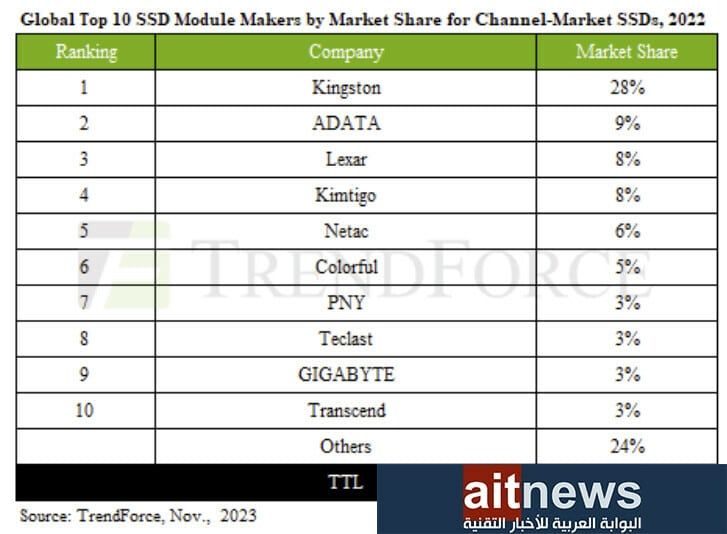 في عام 2022، وعلى الرغم من تحديات السوق، استطاعت العلامات التجارية الخمس الكبرى لأقراص SSD زيادة حصتها السوقية الإجمالية من نسبة تبلغ 53% إلى 59%، ونلاحظ أن الشركات الثلاث: كنجستون، ADATA، وليكسار هي التي تصدرت جدول ترتيب عدد شحنات أقراص SSD في عام 2022، مع احتفاظ كنجستون و ADATA بنمو مستمر في حصتهما السوقية خلال عام 2021 أيضًا.