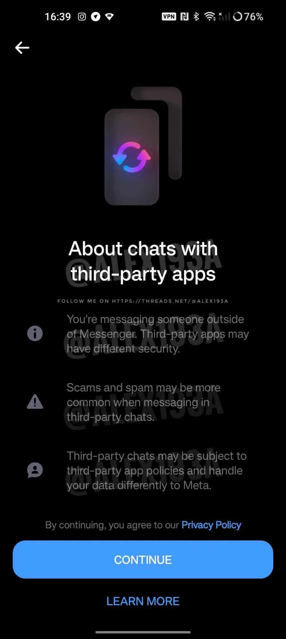 وتأتي محادثات الجهات الخارجية إلى ماسنجر، مما يعني أنه يمكنك قريبًا إجراء محادثات مع المستخدمين الذين يرسلون إليك رسائل من تطبيقات أخرى لا تملكها ميتا نفسها، مع أن هذا الخيار قد لا يكون متاحًا للجميع.