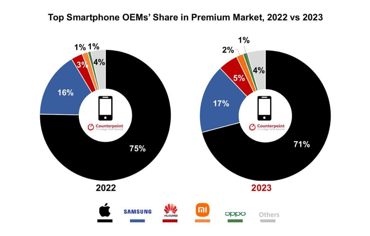وجاءت شركة سامسونج في المركز الثاني بحصة سوقية قدرها 17% بزيادة طفيفة عن العام الماضي، مدفوعةً بالمبيعات القوية لسلسلة جالاكسي S23 وهواتفها القابلة للطي، في حين احتلت هواوي المرتبة الثالثة بنسبة قدرها 5% بفضل مبيعات سلسلة ميت 60 التي صدرت خلال النصف الثاني من عام 2023.
