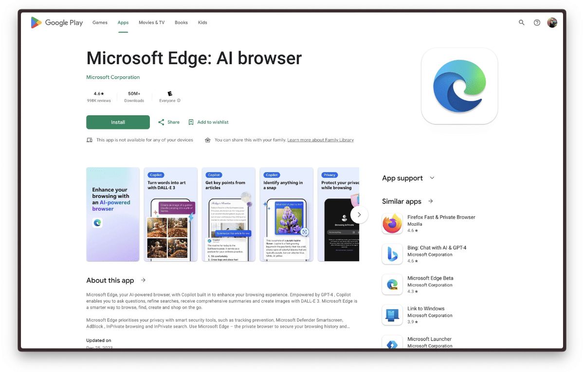 ويقول الوصف: “مايكروسوفت إيدج هو متصفحك الذي يعمل بالذكاء الاصطناعي، مع مساعد الذكاء الاصطناعي Copilot المدمج لتحسين تجربة تصفحك. يتيح لك مساعد Copilot الذي يدعمه GPT-4 طرح الأسئلة وتحسين عمليات البحث وتلقي ملخصات شاملة وإنشاء صور باستخدام DALL-E 3. يعد مايكروسوفت إيدج طريقة ذكية للتصفح والبحث والتسوق”.