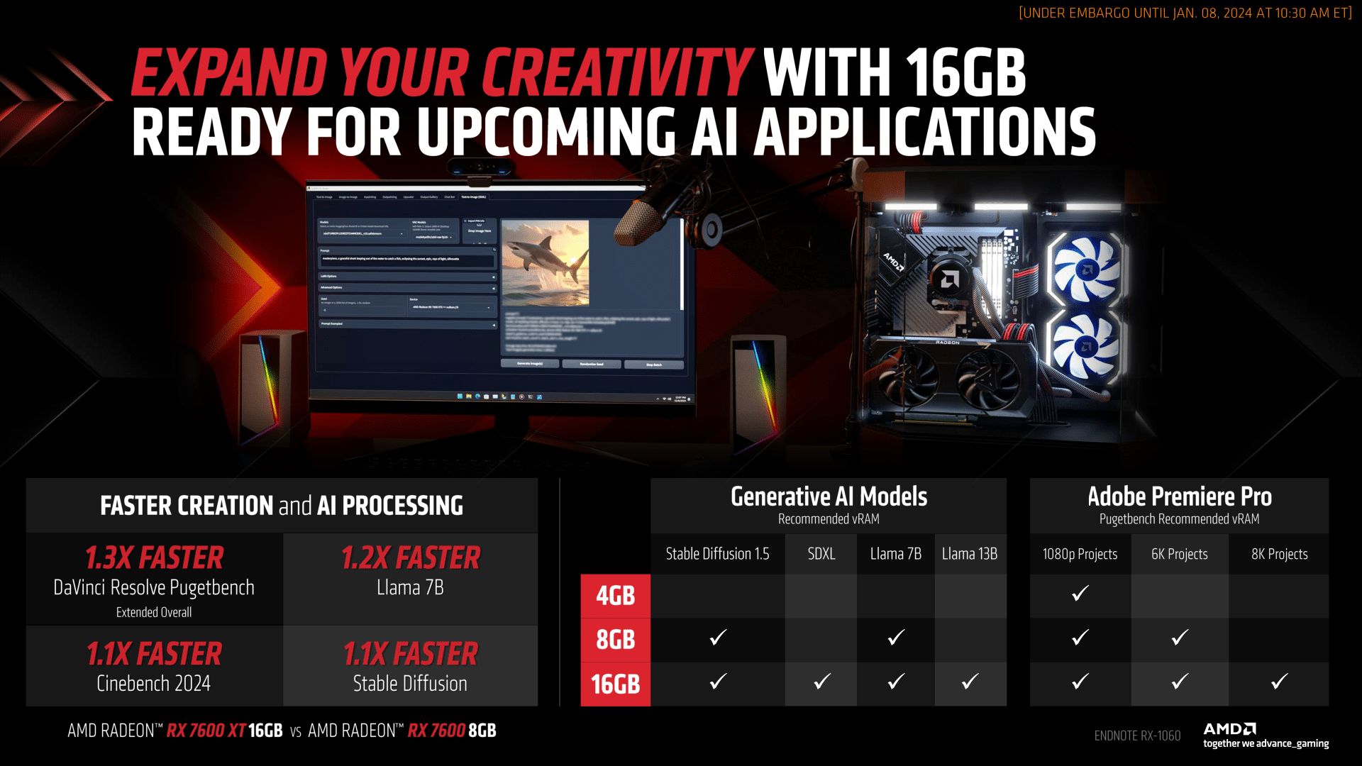 كما تعتمد بطاقة RX 7600 XT على ذاكرة GDDR6 بحجم يصل إلى 16 جيجابايت، بسرعة قدرها 18 جيجابت/ الثانية، مع عرض نطاق ترددي للذاكرة يصل إلى 288 جيجابايت/ الثانية. تعمل الذاكرة المخبأة Infinity Cache بحجم قدره 32 ميجابايت على دعم واجهة الذاكرة التي تبلغ 128 بت، يبدو أن الهدف الآخر لرفع حجم الذاكرة حتى 16 جيجابايت هو حاجة تطبيقات الذكاء الاصطناعي التوليدي إلى هذا الحجم الضخم.