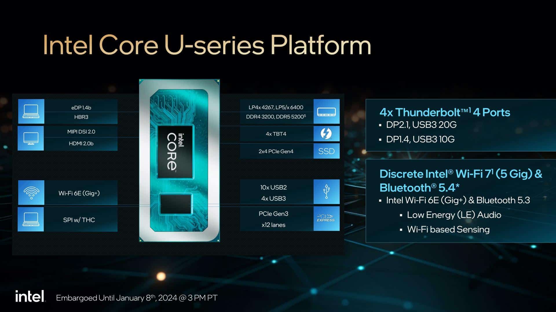 من الجيد أن سلسلة معالجات Core U المستندة إلى معمارية Raptor Lake Refresh تدعم اتصال Thunderbolt 4، وتدعم الاتصال اللاسلكي Wi-Fi 6E، مع 8 مسارات PCIe 4.0 لدعم أقراص SSD، وتدعم ذاكرة LPDDR5X.
