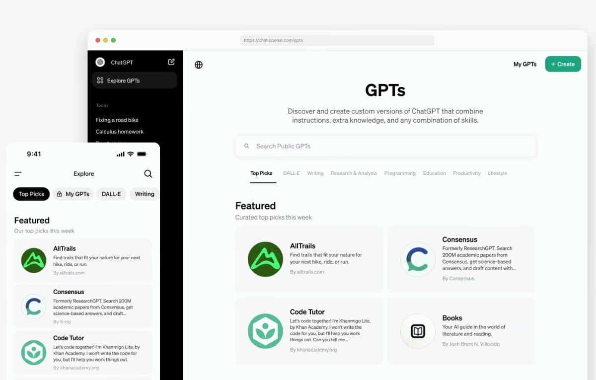 ويتيح المتجر العديد من روبوتات ChatGPT المخصصة، مثل روبوت Consensus للبحث وتجميع النتائج من 200 مليون ورقة بحثية أكاديمية، وروبوت معلم البرمجة من Khan Academy، وروبوت Canva لتصميم العروض التقديمية ومنشورات الشبكات الاجتماعية، وروبوت Books وهو عبارة عن دليل للكتب والأدب، وغيرها من الروبوتات.