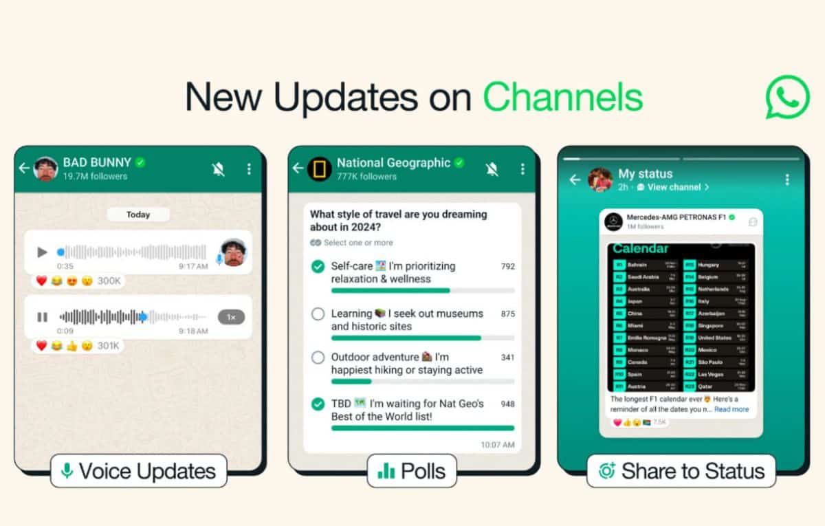 طرحت منصة المراسلة الفورية واتساب مزايا جديدة في قسم القنوات، لتتيح إمكانية نشر التحديثات الصوتية واستطلاعات الرأي، بالإضافة إلى إمكانية زيادة عدد المشرفين في القناة.