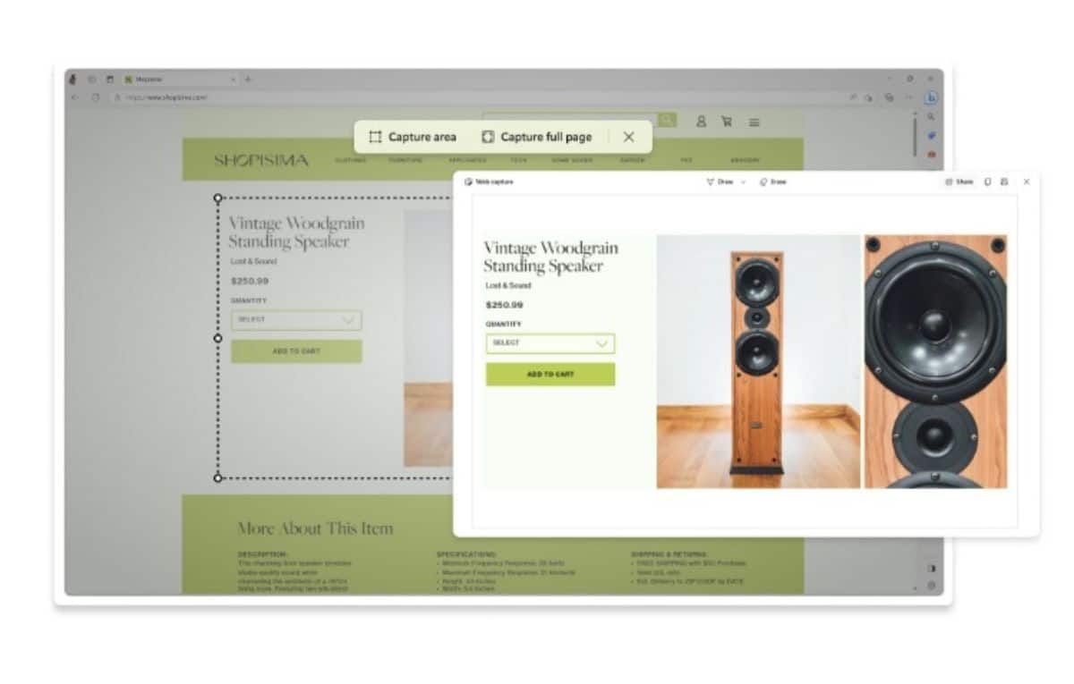 ويحتوي متصفح إيدج منذ سنوات على أداة “التقاط الويب Web Capture“، التي تتيح التقاط صورة من صفحة ويب كاملة أو منطقة محددة فيها، مع إمكانية إضافة تعليقات أو رسومات عليها قبل حفظها في الجهاز، بالإضافة إلى خاصية البحث البصري، التي تتعرف محتوى اللقطة، وتبحث في الويب عن محتوى مشابه لها.