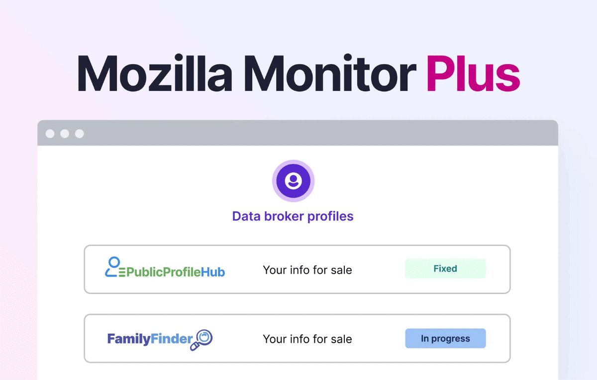 تقدم موزيلا خدمة اشتراك جديدة Mozilla Monitor Plus تساعد الأشخاص في تحديد موقع معلوماتهم الشخصية والحساسة وإزالتها من مواقع وسطاء البيانات عبر الويب.