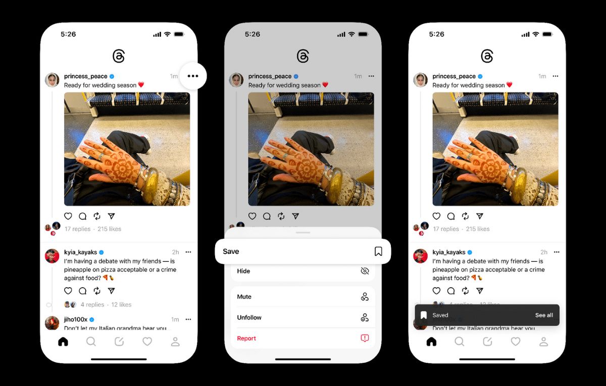 وقالت ميتا إن التحديث يبدأ بصفته اختبارًا محدودًا. ووفقًا للقطات الشاشة التي شاركتها ميتا، يبدو زر الحفظ في ثردز مشابهًا جدًا لإصدار إنستاجرام من الميزة.