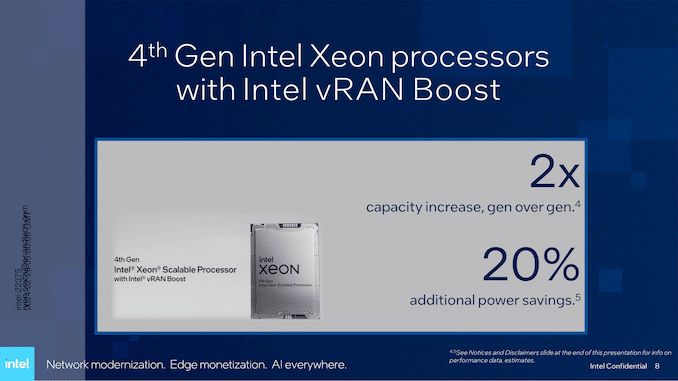 وباستخدام معزّز شبكة النفاذ الراديوية الافتراضية، وهو مُسرِع متكامل ضمن معالجات Xeon، تؤكد إنتل أن الجيل الرابع من معالجات Xeon يجب أن يكون قادرًا على تقليل معدل استهلاك الطاقة بنسبة تصل إلى 20%.
