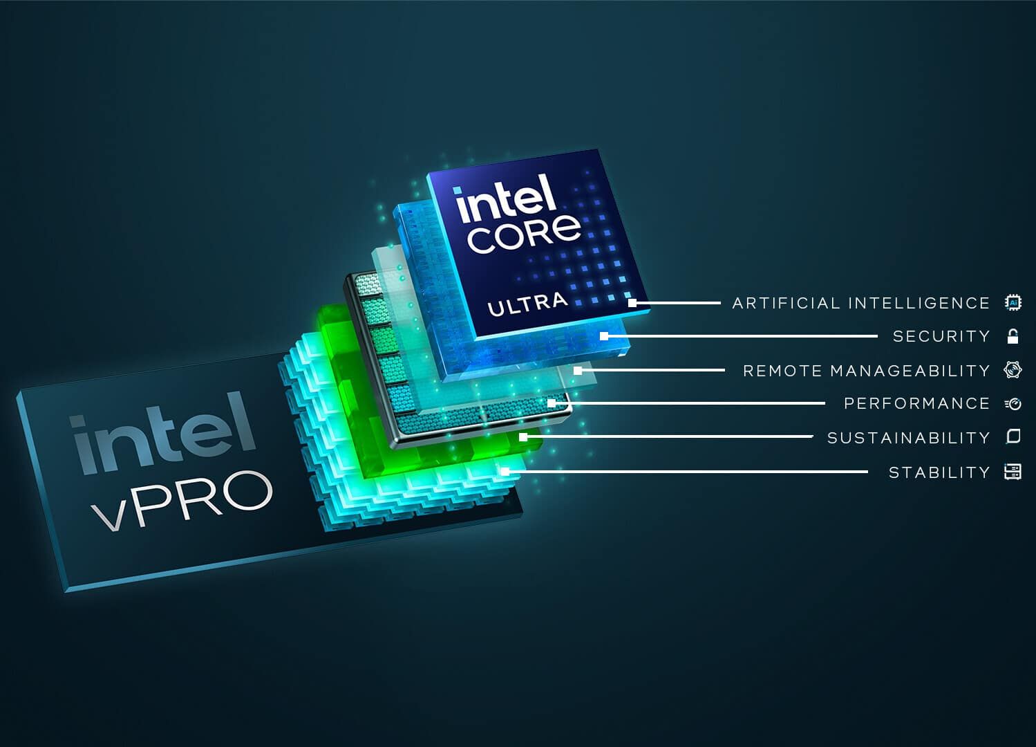 وتدعم منصة vPro Essential و vPro Enterprise العديد من معالجات Raptor Lake-R Core من الجيل الرابع عشر، والعديد من معالجات الحواسيب المحمولة Meteor Lake Core Ultra.