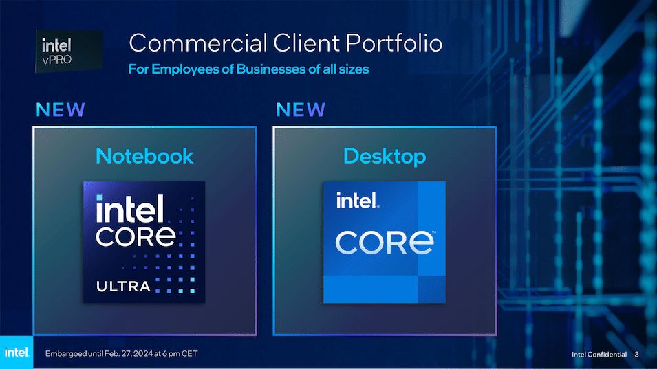 وأعلنت إنتل في مؤتمر MWC 2024 أن الترقية الأخيرة لمنصة vPro، المخصصة للشركات، توفر مزايا أجهزة الحواسيب الشخصية المزودة بالذكاء الاصطناعي لعملاء أجهزة الحواسيب المحمولة التجارية.