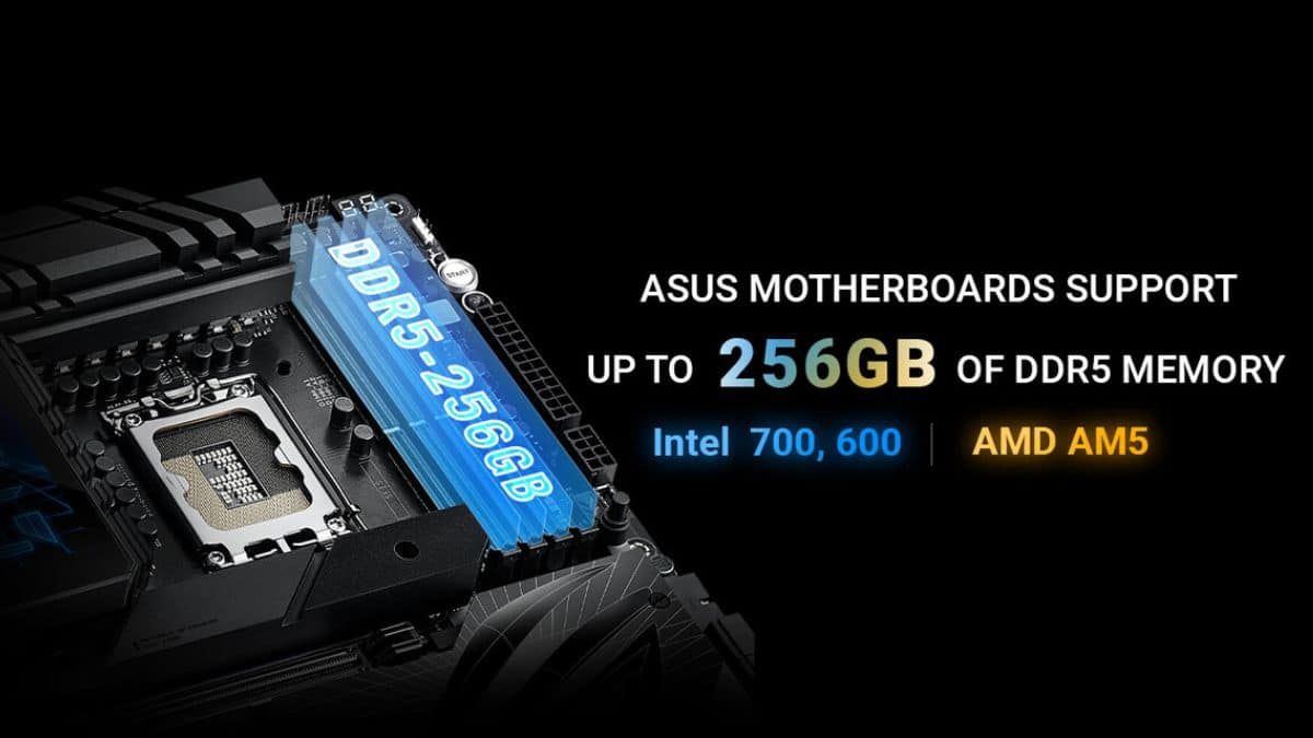 أعلنت أسوس دعم ذاكرة DDR5 بحجم قدره 256 جيجابايت للوحات الأم المكونة من 4 فتحات DIMM، وذاكرة بحجم قدره 128 جيجابايت للوحات الأم المكونة من فتحتي DIMM، سواء كانت المنصة تعمل بسلسلة شرائح إنتل 700 أو تعمل بسلسلة شرائح 600 من AMD.