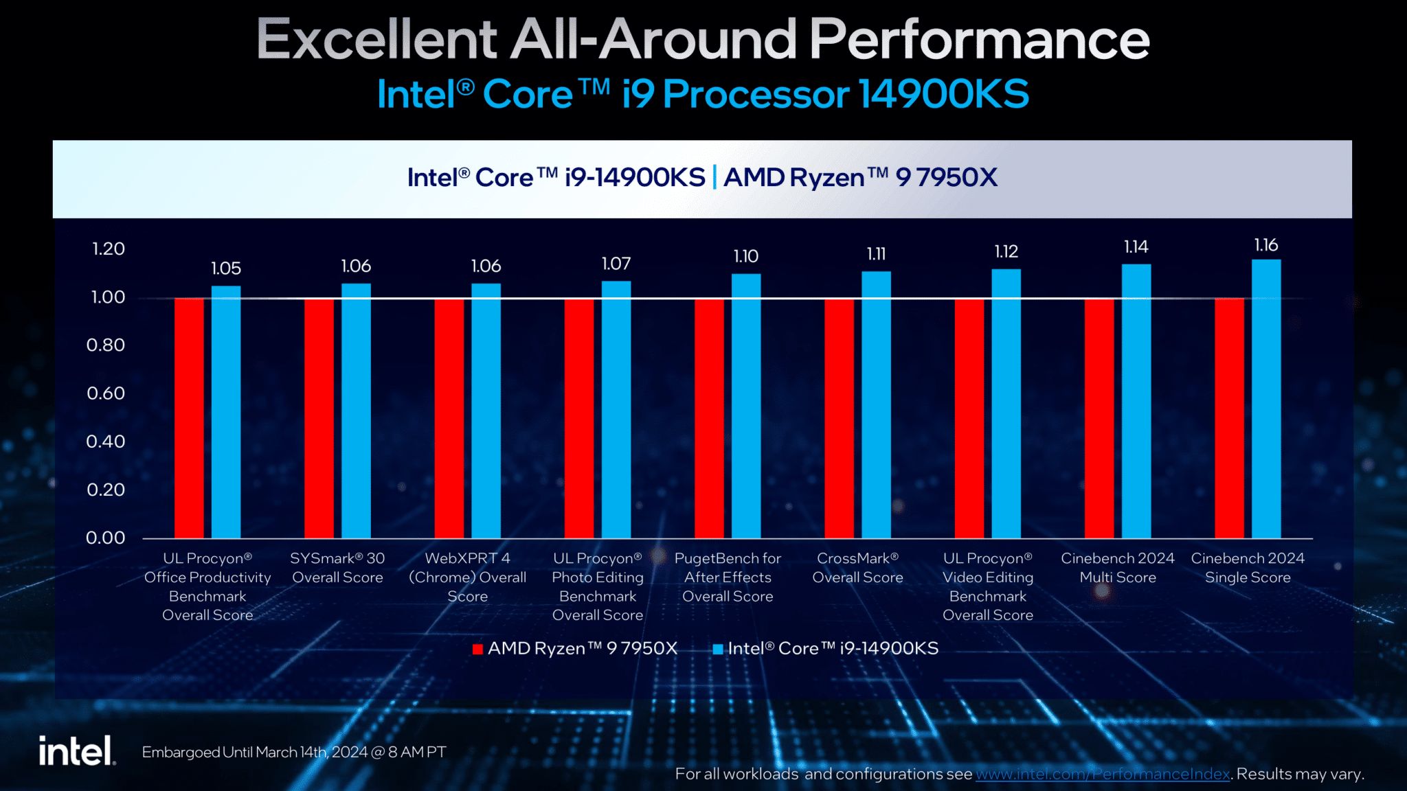 ويعتمد المعالج المركزي Core i9-14900KS على رقاقة المعالج المركزي i9-14900K نفسها المستندة إلى معمارية Raptor Lake Refresh، إذ يحتوي على 8 نويات P تعمل بتردد معزز يصل إلى 6.20 جيجاهرتز بزيادة قدرها 200 ميجاهرتز، مقارنة بتردد نويات P مع معالج i9-14900K، و 16 نواة E تعمل بتردد معزز يصل إلى 4.50 جيجاهرتز بزيادة قدرها 100 ميجاهرتز.