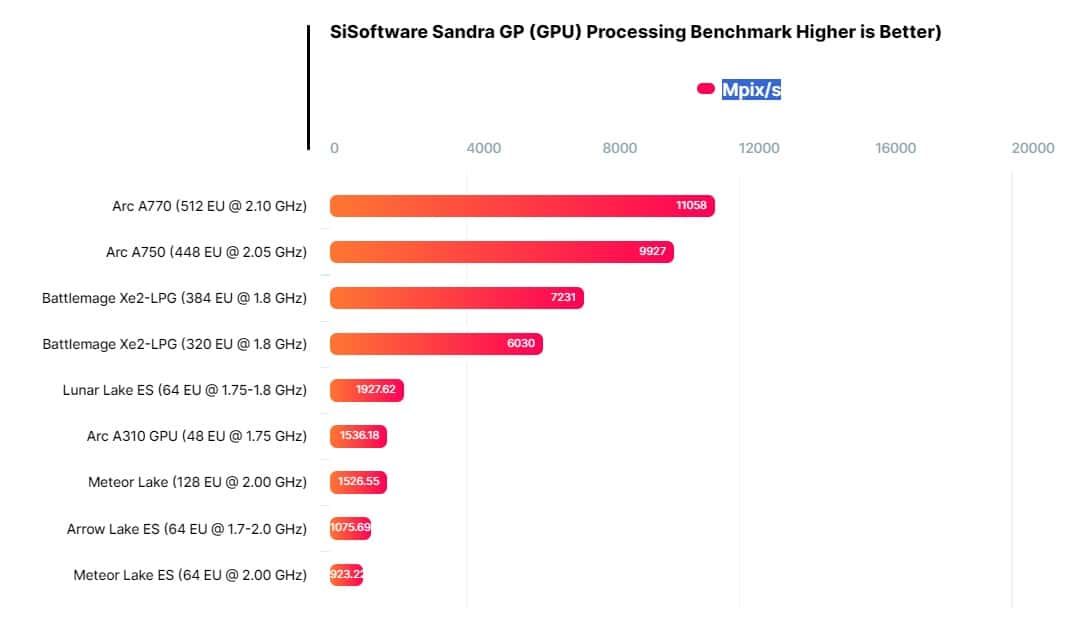 وللمقارنة، حققت وحدة معالج الرسوم Arc A770 نتيجة تصل إلى 11058 ميجابكسل/ الثانية في حين حققت وحدة معالجة الرسوم Arc A750 نتيجة تصل إلى 9927 ميجابكسل/ الثانية.