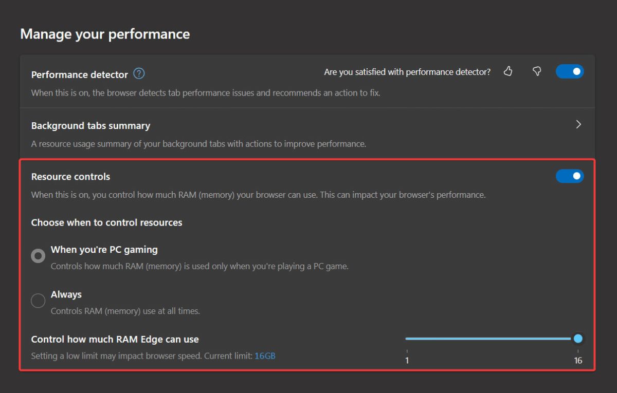 وتحذر مايكروسوفت من أن الحد من استخدام ذاكرة الوصول العشوائي قد يؤثر سلبًا في أداء المتصفح.