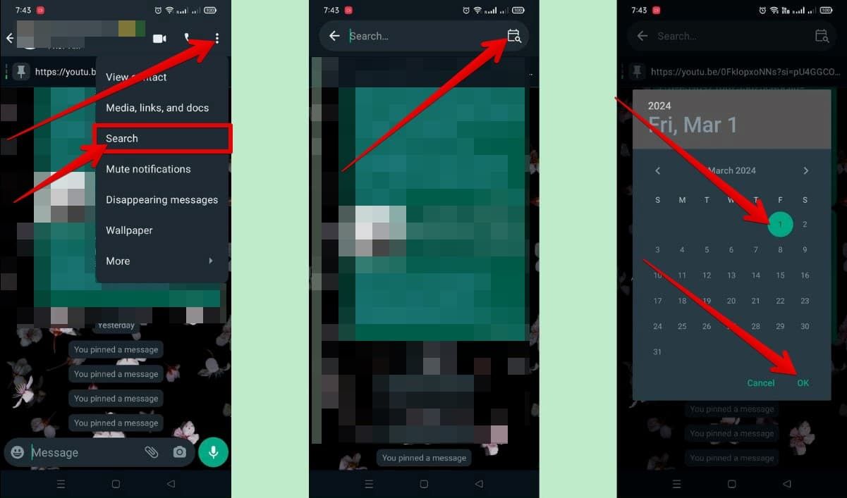 - بمجرد تحديد التاريخ، والضغط على خيار (Ok) الظاهر في أسفل واجهة التقويم، سينقلك التطبيق تلقائيًا إلى الرسائل المرسلة في هذا التاريخ المحدد.