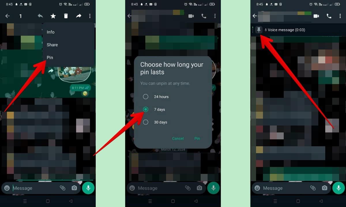 ويمكنك تثبيت ما يصل إلى ثلاث رسائل في أعلى أي محادثة، وبمجرد تثبيت الرسالة، تظل في أعلى المحادثة على هيئة لافتة لمدة 24 ساعة أو 7 أيام أو 30 يومًا. وفي حالة تثبيت أكثر من رسالة، سيظهر في اللافتة عدد الرسائل المثبتة، كما تظهر أحدث رسالة مُثبتة أولًا في اللافتة، ولرؤية الرسائل المثبتة الأخرى، يمكنك النقر على اللافتة للوصول إليها.